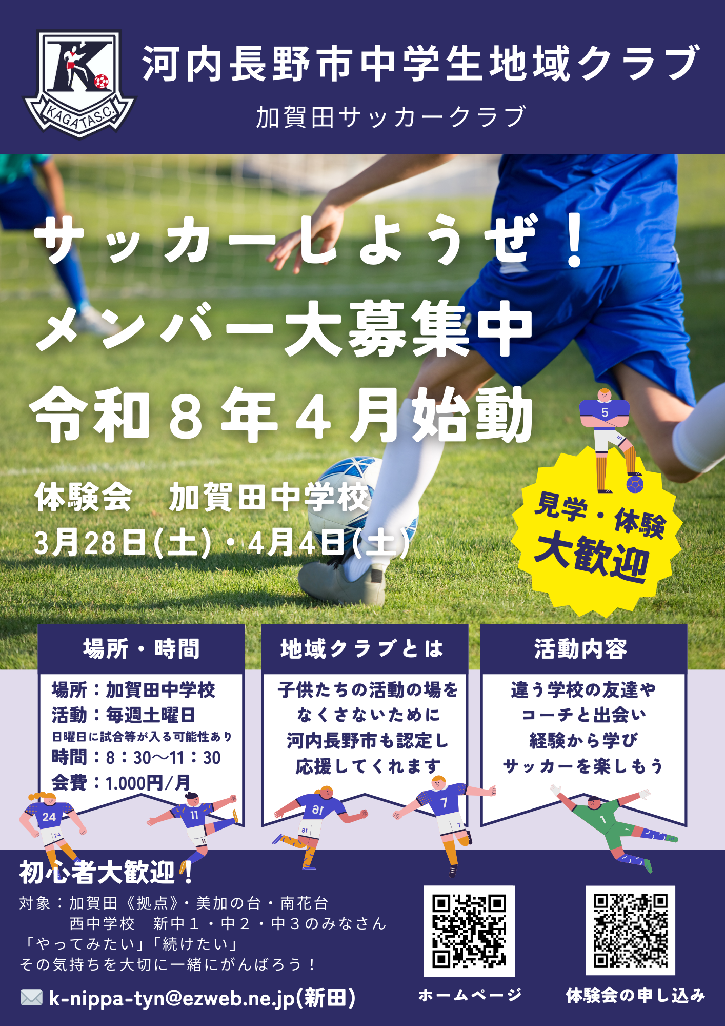 | 【クラブ員募集中!】 サッカーをやってみたい!サッカーを楽しみたい!仲間を作りたい!そんな小学生のみなさん、加賀田サッカークラブでサッカーを始めてみませんか。本クラブ出身のコーチを中心に、優しく、楽しくサッカーを指導します。どの学年も大歓迎!男女は問いません。 コーチ一同、新入団のみなさんを心よりお待ちしています! まずは体験入部で参加してください! 1年~3年 毎週土曜日13:30~(6月~9月 8:30~) 石仏小学校 4年~6年 毎週土曜日13:00~(6月~9月 8:00~) 美加の台小学校 ※運動できる服装だけで参加OK ※試合が入っているときは練習はありません。ご了承ください。 ※保護者のお茶当番制はありません! ※本クラブの入団に関する資料は こちら をご覧ください。 ★就学前のお子様も「加賀田kids」として、週に一度、サッカーを楽しんでいます。 詳しくはここをクリック |